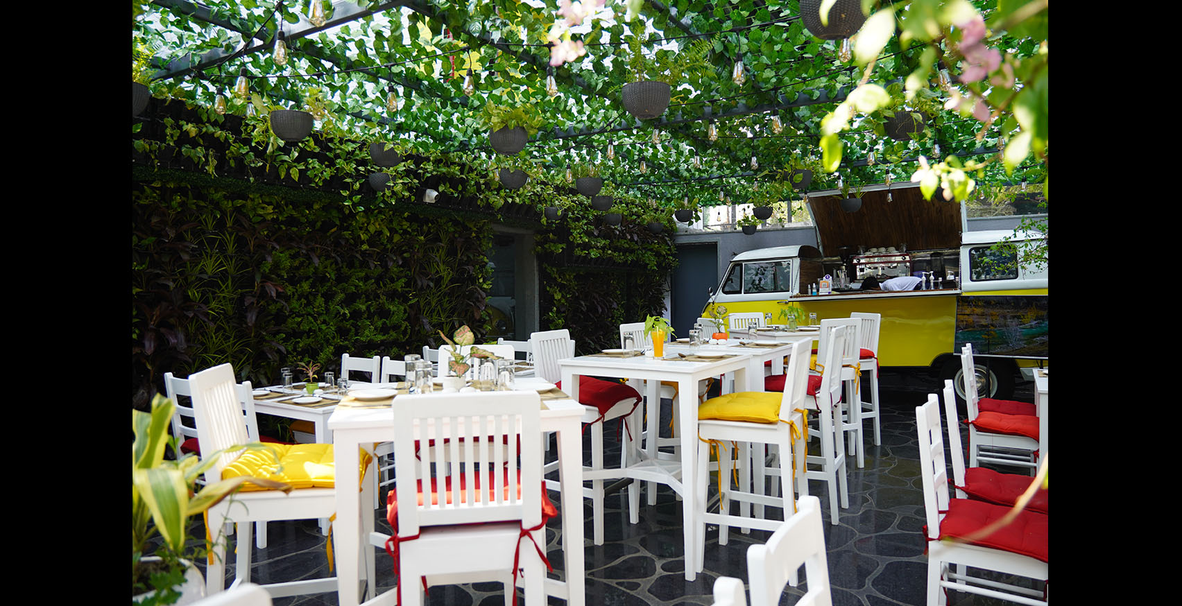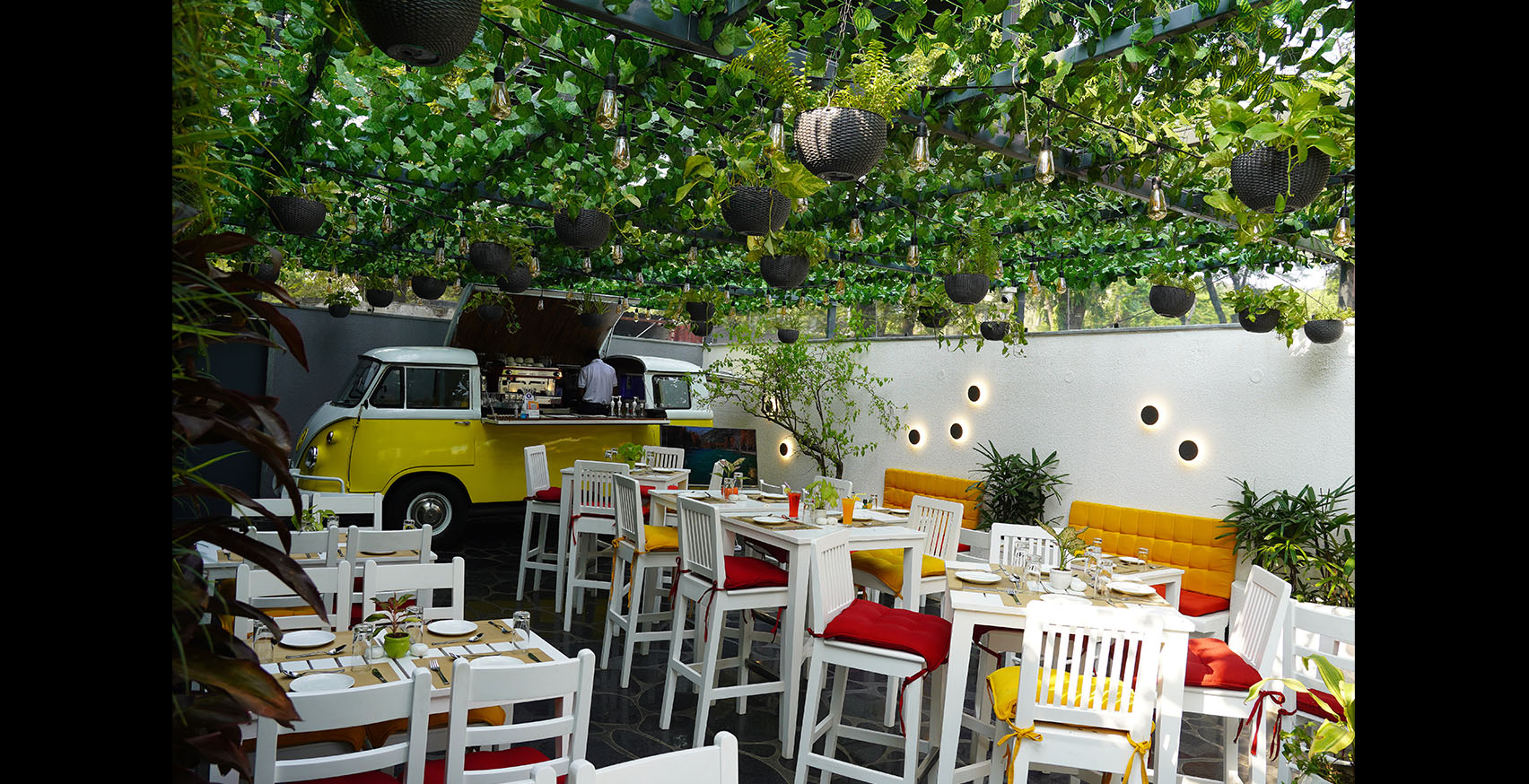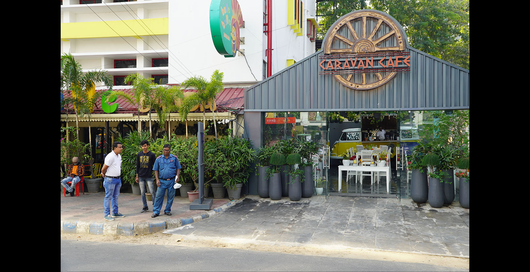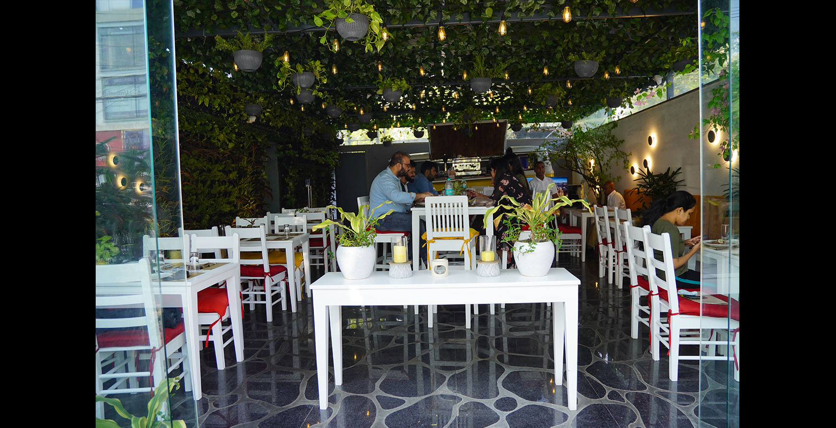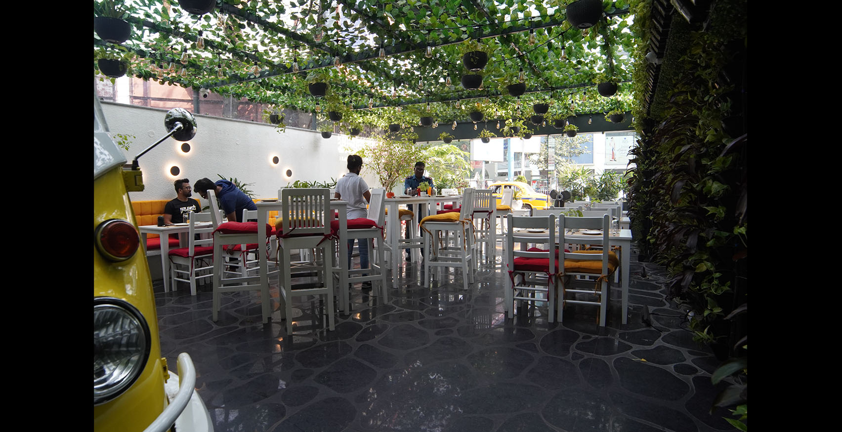 It’s a semi covered 44-seater Café in Salt-Lake, Kolkata which celebrates streetscaped experience of Greece, an outdoor dining experience for all ages. The site was an open space parking for the adjacent building which converted into a Continental Cuisine Café.