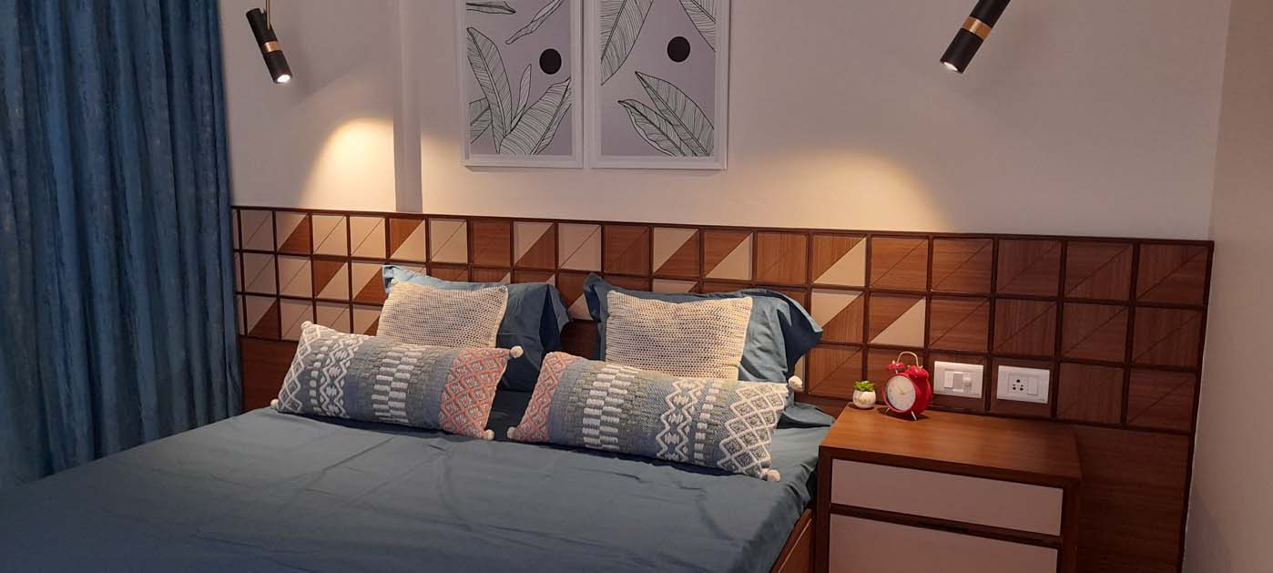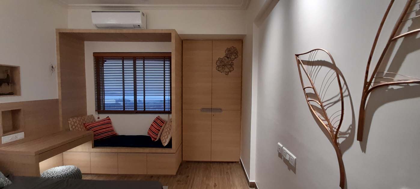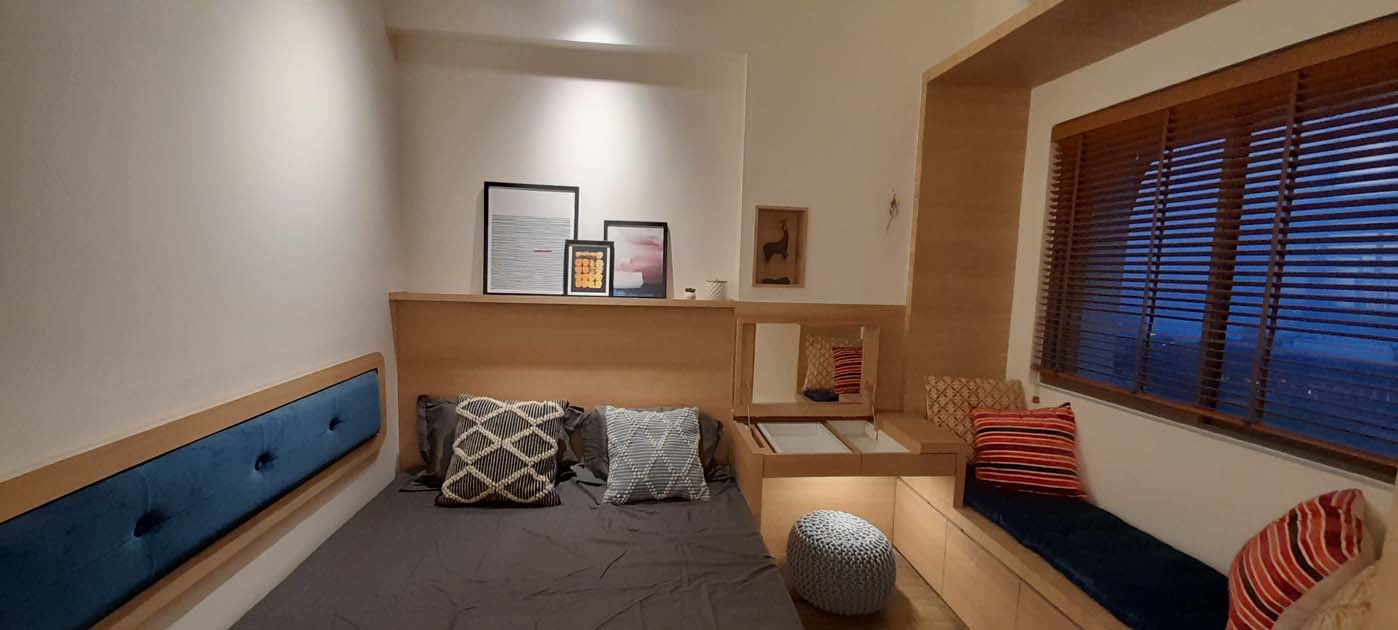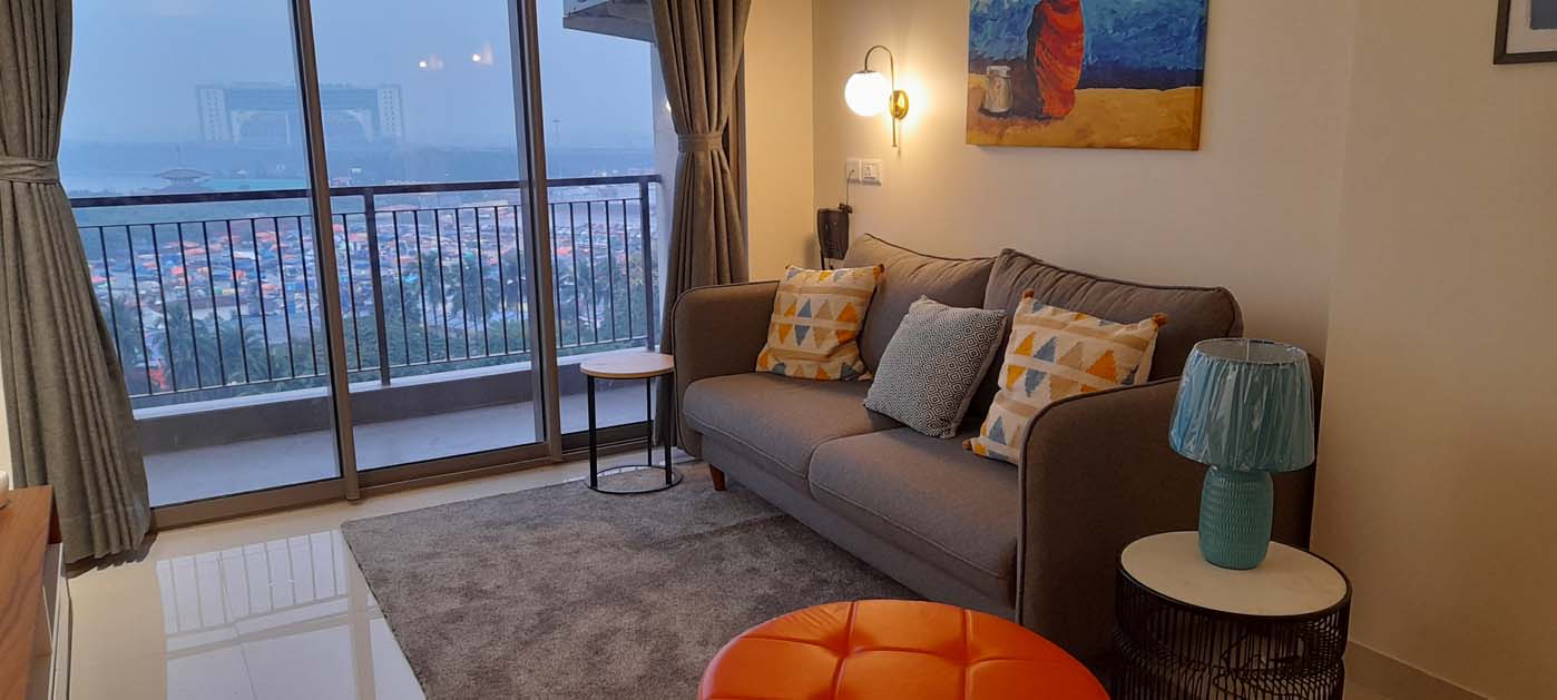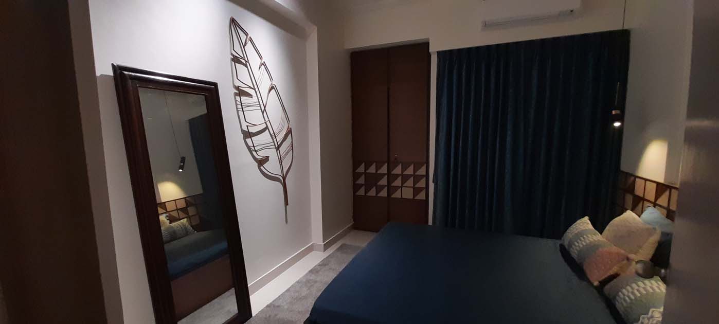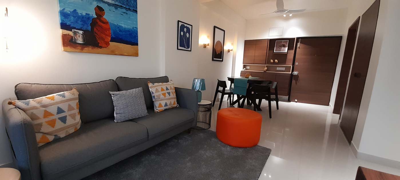 2BHK guest house overlooking the vista of vast lake, green landscape and beautiful sunset. Minimalist design approach allows the space to complement the metal wire wall murals and coordinated wanderlust painting on living room wall sets apt on the white walls as the canvas.